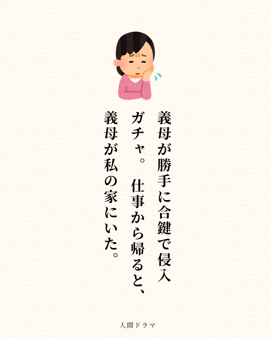 ガチャ。 仕事から帰ると、義母が私の家にいた。