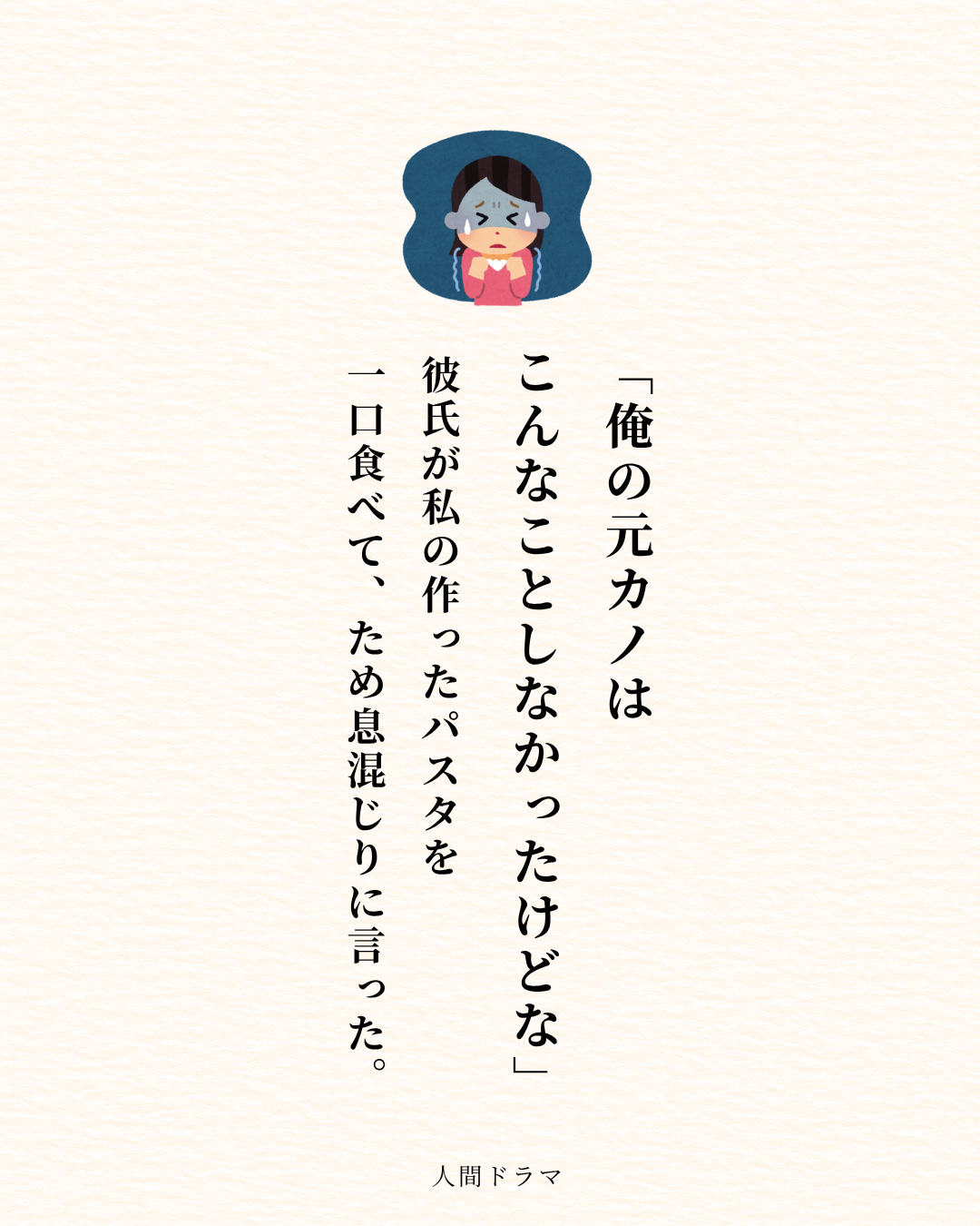 「どういう意味?」 「いや、元カノはもっと本格的なパスタ作ってくれたんだよね。これ、ちょっと麺が固いかな」 「じゃあ食べなくていいよ」 「怒るなよ。ただの感想じゃん」