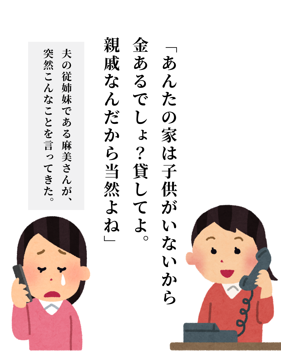 「あんたの家は子供がいないから金あるでしょ?貸してよ。親戚なんだから当然よね」