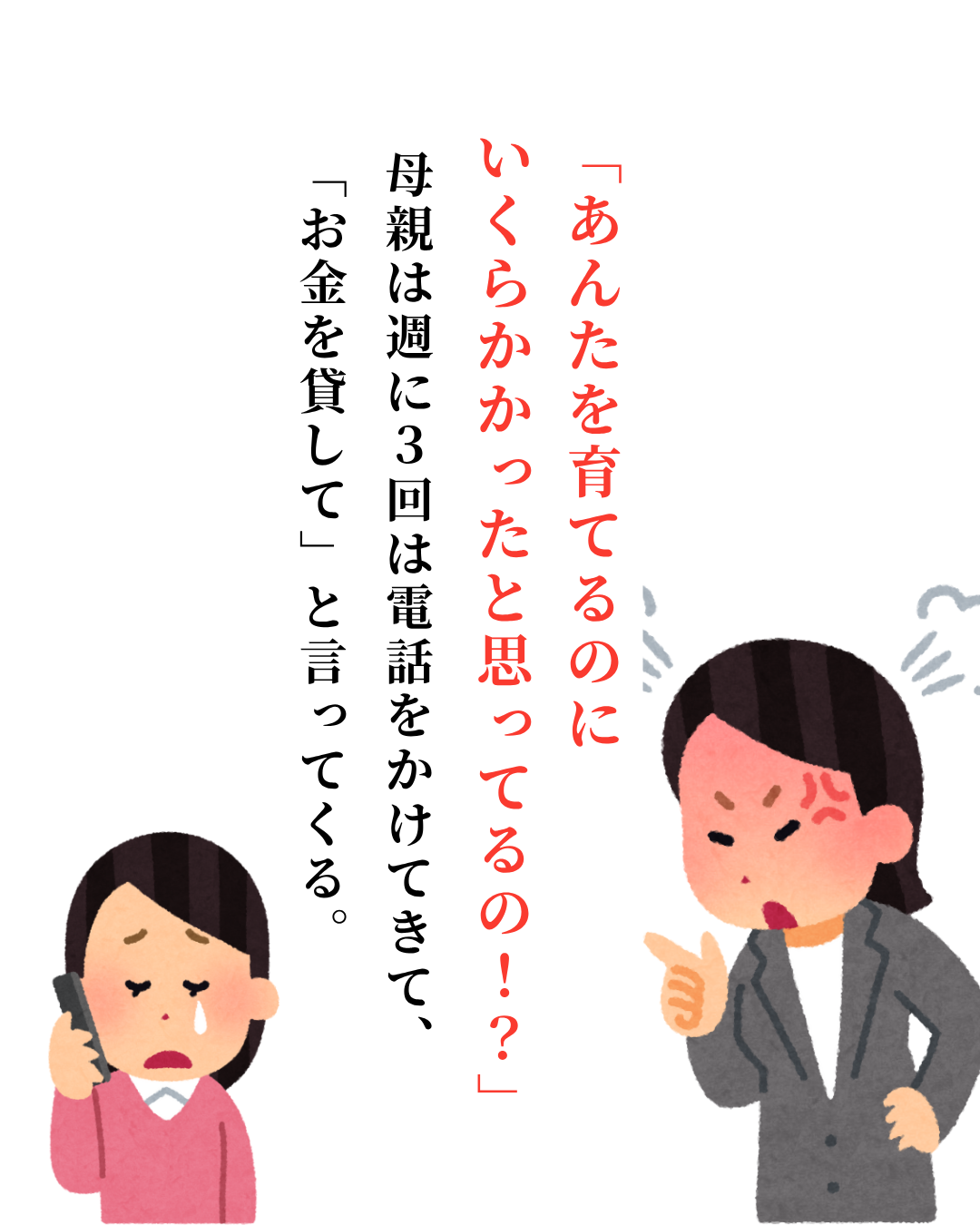 私は28歳の会社員。一人暮らしを始めて5年になる。でも母親は週に3回は電話をかけてきて、「お金を貸して」と言ってくる。貸してと言いながら、一度も返ってきたことはない。