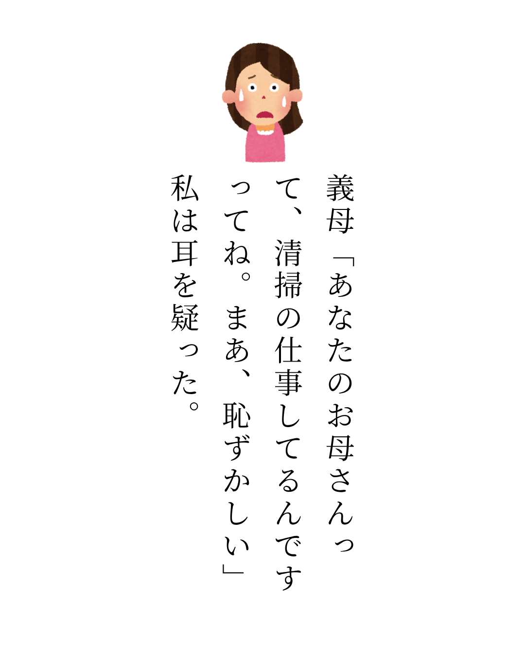 義母「あなたのお母さんって、清掃の仕事してるんですってね。まあ、恥ずかしい」