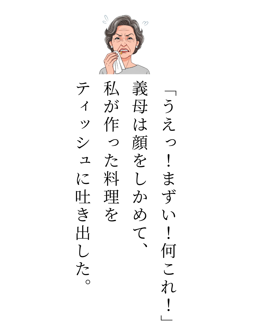 「こんなもの、孫には食べさせられないわ。味付けがおかしいし、肉も固い。あなた、本当に料理できるの?」