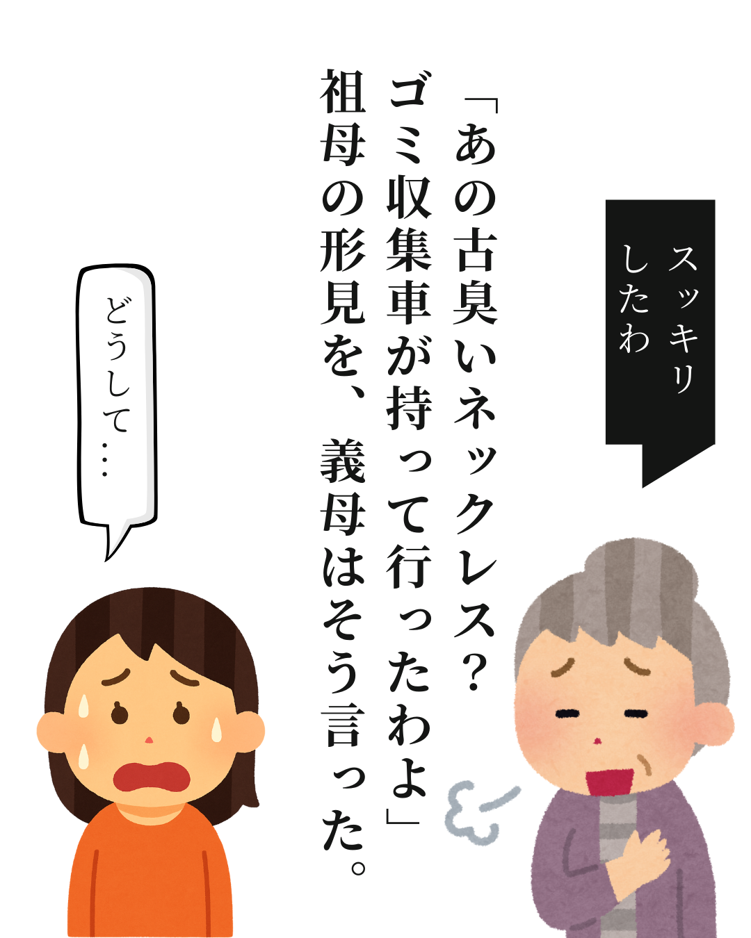 「あの古臭いネックレス?ゴミ収集車が持って行ったわよ」
