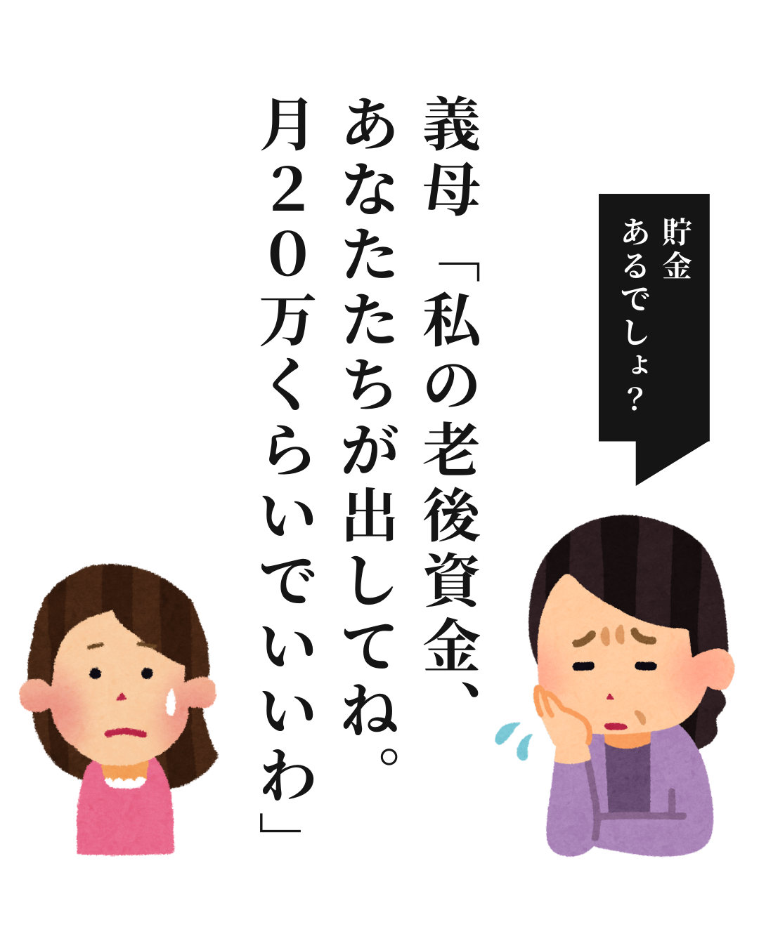 【全編】義母「私の老後資金、あなたたちが出してね。月20万くらいでいいわ」 スポンサーリンク スカッと春香 Twitter Facebook はてブ Pocket LINE コピー 2026.02.03 スポンサーリンク 義母「老後はあなたがいると安心だわ」 「えっ?」 義実家でお茶を飲んでいた時、義母が突然そう言った。 私は35歳、夫は37歳。結婚7年目の夫婦で、子供はいない。私たち夫婦の選択だ。 義母が続ける。 「あなたたち夫婦は子供がいないから、お金に余裕があるでしょ?」 「それはそうですが…まあ、ある程度は」 私が曖昧に答えると、義母はニコニコしながら言った。 「だから私の老後資金、あなたたちが出してね。月20万くらいでいいわ」 【続きは次のページで】 次へ 12